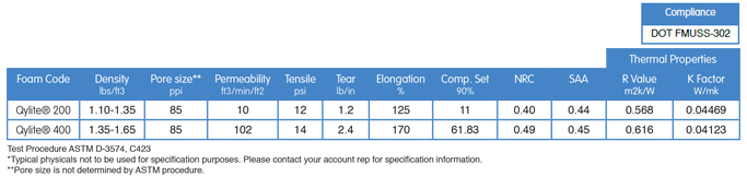 Qylite® 200 and 400 are Department of Transportation FMVSS-302 certified, and formulated with low-density ether foam technology having unique lightweight cellular structures that enhance sound absorbing performance with some damping characteristics. Qylite® 200 and 400 perform well in harsh environments and facilitate many final form processing methods like compression molding where aesthetics and engineered performance need to be balanced. These foams have excellent high and low temperatures stability with attractive heat-aging, wear, and abrasion properties.