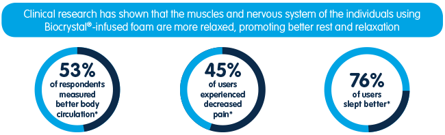 Sleeping, sitting or resting on foam infused with Biocrystal® revitalizes the body, providing the quality rest needed to perform well all day. The users body is recharged and renewed – better able to keep up with an active lifestyle. In addition, this enveloping memory foam provides the comfort and pressure relief needed to rest well and the open cell structure ensures improved breathability and greater heat dissipation when compared to a traditional visco.