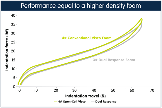 FXI’s reactive dual-response design is engineered to enhance comfort and pressure relief while providing conforming support. The initial soft feel slowly conforms to the body before gently pushing back. Our unique chemistry in combination with VPF™ technology produces a 3 lb foam that performs like a high density 4 lb foam, offering you and your customer a higher level of durability and comfort. Dual-Response Foam is also less temperature-sensitive than typical memory foams, providing a more consistent level of comfort across a broader range of temperatures.